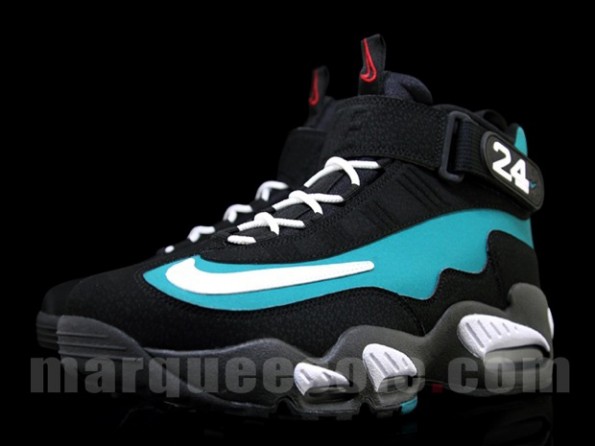Here's the Nike Air Griffey Max 1 in the Emerald colorway. The model features a mix of black, emerald, and white over the nubuck upper. The number 24 is located on the ankle strap as well as the Nike Swoosh that sits near the toe.